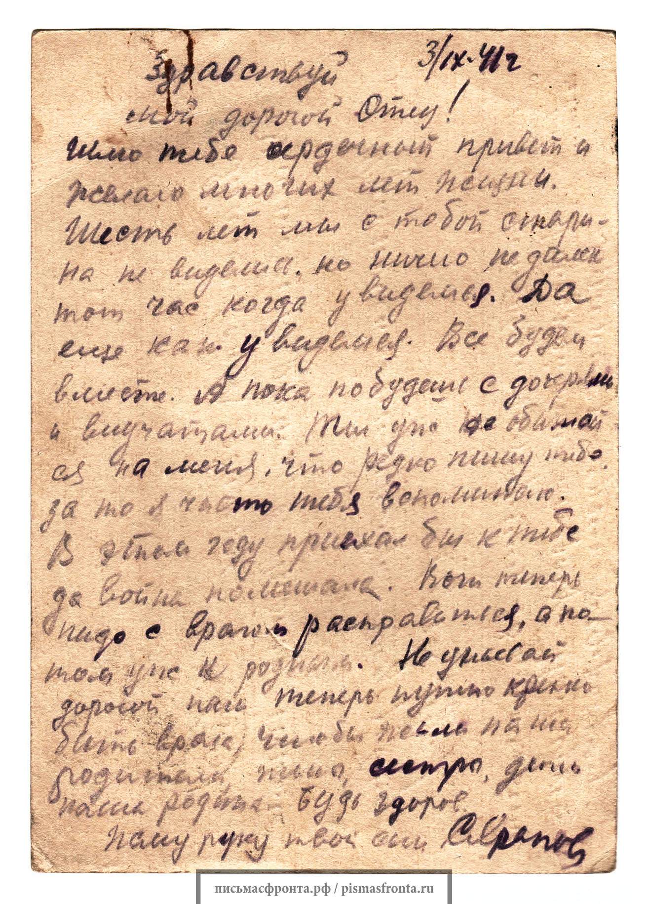 Шлю тебе сердечный привет и желаю многих лет жизни. Шесть лет мы с тобой, старина, не виделись... Но ничего, недалёк тот час, когда увидимся. Да ещё как увидимся — все будем вместе! А пока побудешь с дочерьми и внучатами. Ты, уж, не обижайся на меня, что редко пишу тебе, — зато я часто тебя вспоминаю. В этом году приехал бы к тебе, да война помешала. Вот теперь надо с врагом расправиться, а потом уже — к родным.