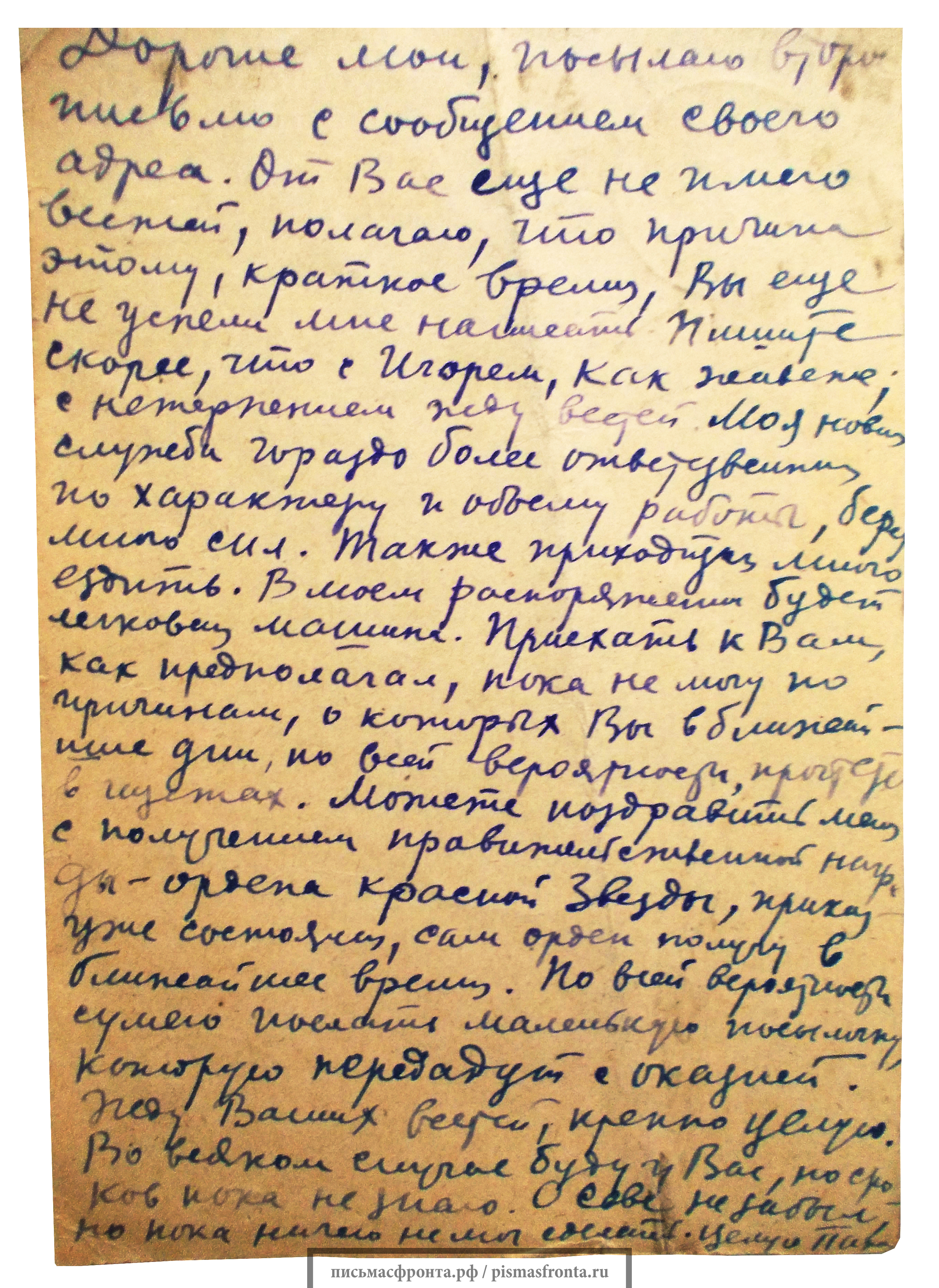 ...Моя новая служба гораздо более ответственная по характеру и объёму работы — берёт много сил. Также приходится много ездить — в моем распоряжении машина. Приехать к вам, как предполагал, пока не могу по причинам, о которых вы в ближайшие дни, по всей вероятности, прочтёте в газетах. Можете поздравить меня с получением правительственной награды — ордена Красной Звезды (приказ уже составлен, сам орден получу в ближайшее время)...