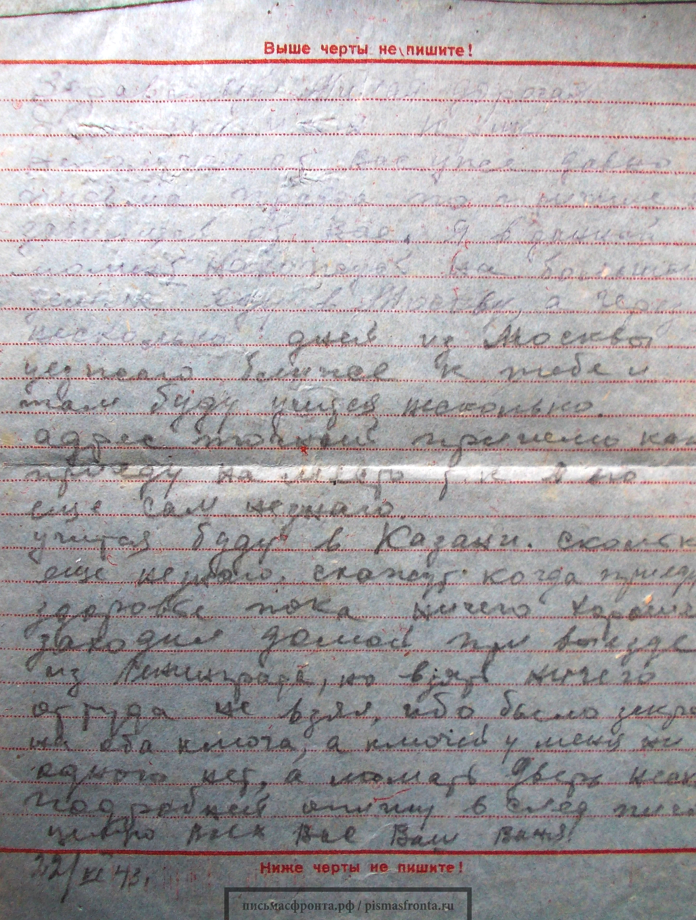 Я в данный момент нахожусь на большой земле, еду в Москву. А через несколько дней из Москвы уезжаю ближе к тебе, и там буду учиться... Учиться буду в Казани... Заходил домой при выезде из Ленинграда...