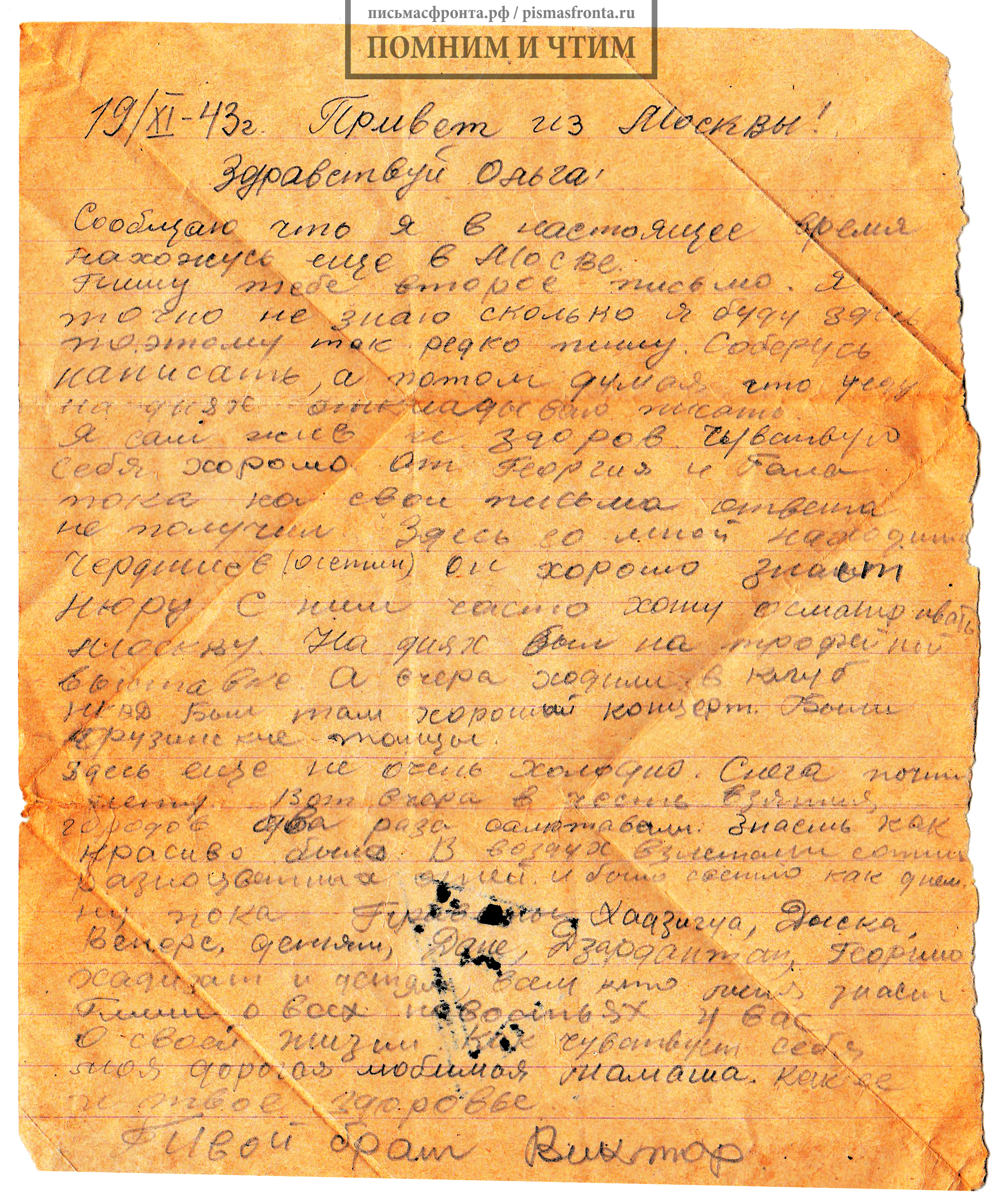 Пишу тебе второе письмо. Я точно не знаю, сколько я буду здесь, поэтому так редко пишу. Соберусь написать, а потом, думая, что уеду на днях, откладываю письмо. Я сам жив и здоров. От Георгия и Николая пока на свои письма ответа не получил. С другом часто хожу осматривать Москву. На днях был на трофейной выставке. А вчера ходили в клуб НКВД. Был там хороший концерт, были грузинские танцы.