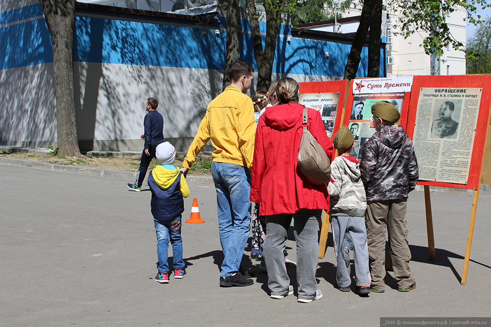 Акция с раздачей «фронтовых треугольников» с текстами настоящих писем фронтовиков проводилась в Центральном парке культуры и отдыха города Владимира. Активисты движения «Суть времени» в рамках празднования Дня Победы раздали более 1 500 писем и флаеров с портретами владимирцев-Героев Советского Союза и описанием их воинских подвигов.