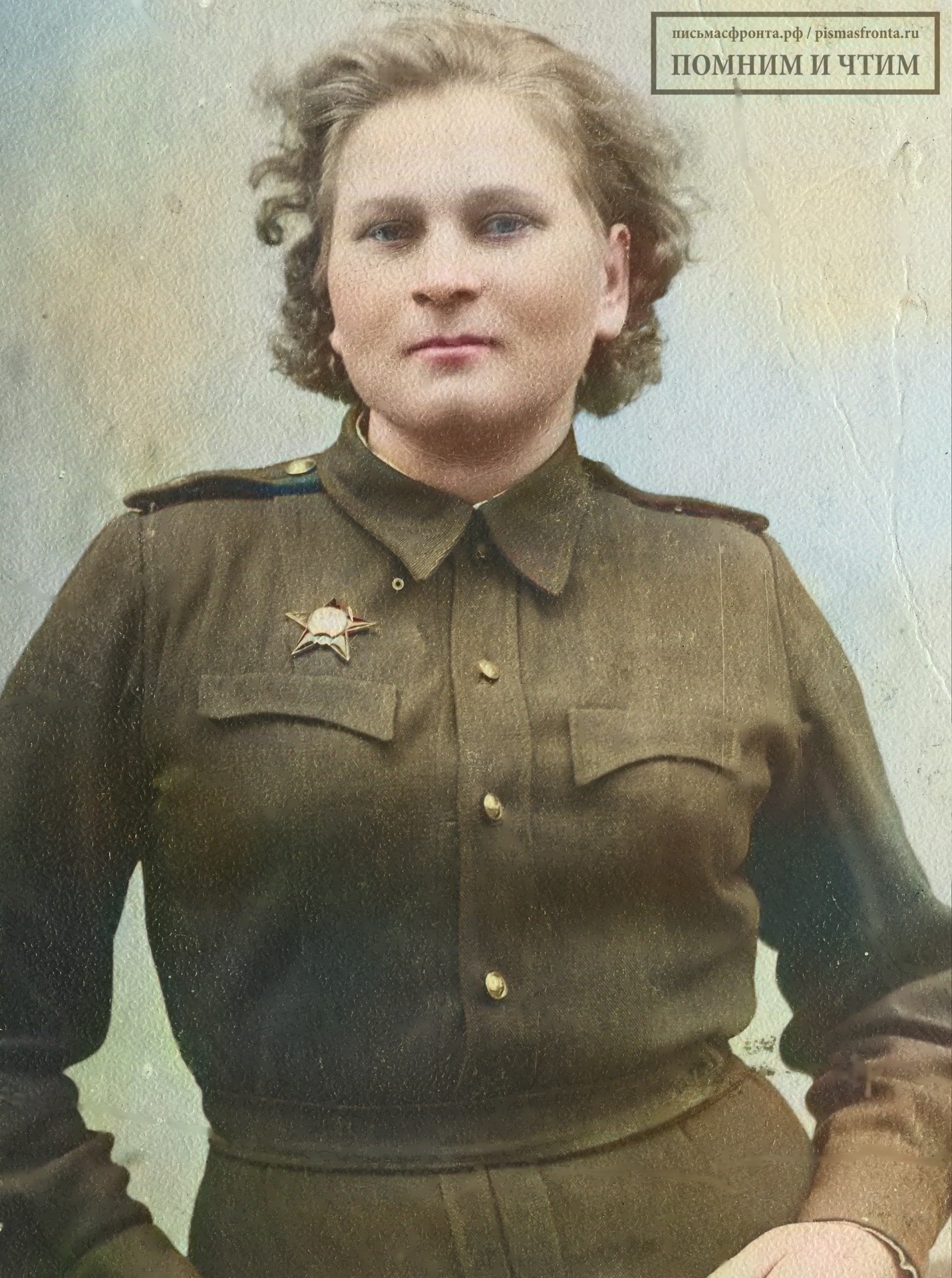 Я в армии впервые узнала жизнь, научилась понимать людей, увидела много человеческих страданий. Армия многое мне дала, я смело преодолевала трудности, мне не страшна была никакая опасность, я сразу же почти отличилась, обо мне написали в газете «Патриот Родины», я была ранена — удачно, я осталась невредимой. В июне 1942 я получила орден «Красной звезды». Командование высоко оценило мои скромные подвиги, и я горжусь этим. Я уже стала членом Партии. Я чувствовала, что я уже не такая простая деревенская девчонка, что я могла и могу быть способной защищать свою любимую Родину от фашизма, который захотел отнять нашу молодость, разлучил и разбил многим счастье, велика ненависть и месть к проклятому извергу-фашизму! Много есть чего хорошего ещё в жизни, чего мы не знаем, но хотели бы узнать, лишь бы вы — молодёжь — были счастливы. Надо отдавать все силы общему делу в разгроме врага, чтобы наступил радостный час победы и счастливой жизни. Времени свободного мало для сна. В сутки — 5 часов, не пробудем на одном месте и десяти дней, как идём вперёд, на Запад, вместе с родной Красной Армией освобождаем свою родную Ленинградскую землю!