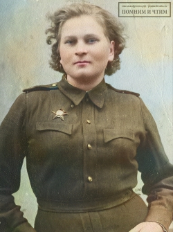 22.02.1942. Получила ранение поясничной области под г. Колпино во время спасения с поля боя раненого командира танкового батальона полковника Ястребова, которого они с подругой ползком тащили на плащ-палатке 3 км до военно-полевого госпиталя зимой в мороз -42°C: