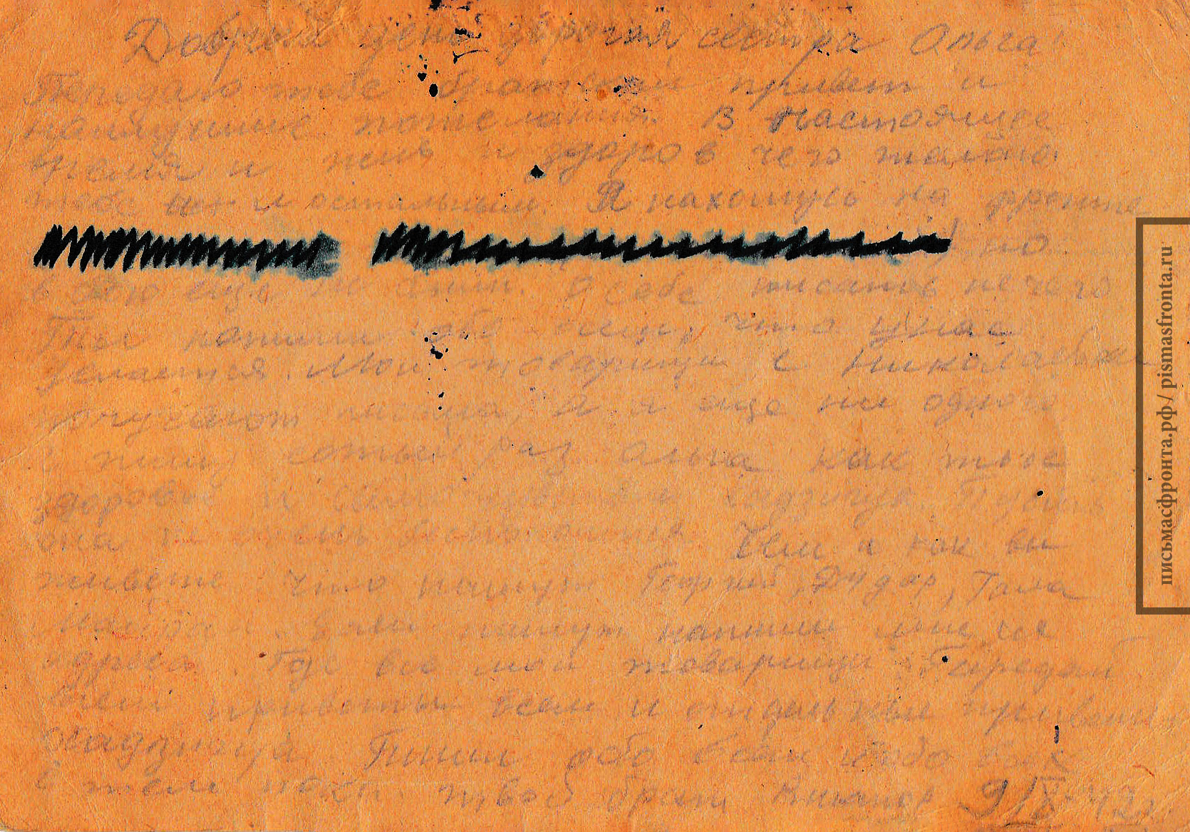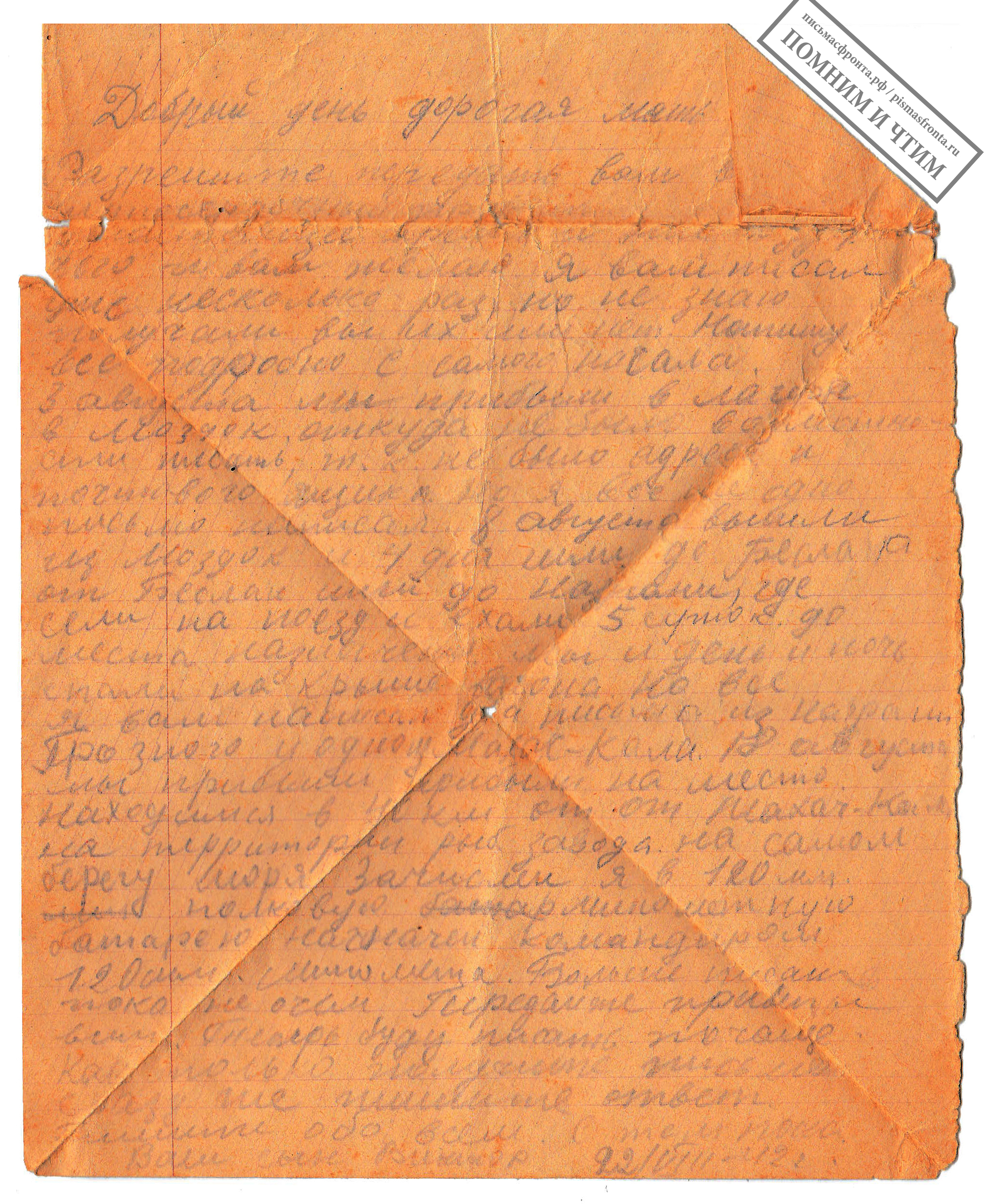 В августе месяце 1942 года в р-не Махач-Кала была сформирована 337 стрелковая дивизия, где я был наводчиком 120-мм миномета. С сентября 1942 года находился на фронте в районе Моздока. Был наводчиком миномета, а затем стал командиром расчета. В ноябре 1942 года вступил в кандидаты ВКП(б). В декабре 1942 года был направлен политотделом дивизии в Тбилисское военно-политическое училище. В марте 1943 года окончил училище, и мне было присвоено звание лейтенанта. В мае 1943 года был назначен заместителем командира стрелковой роты по политчасти во II гвардейскую стрелковую дивизию, которая вела боевые действия на Таманском полуострове. В июне 1943 года после упразднения института зам. ком. рот по политчасти я был направлен в Сорочинское зенитно-пулемётное училище Красной Армии. В октябре окончил выше указ. училище и был назначен командиром зенитно-пулемётного взвода во вновь формирующуюся 67 зенитно-артиллерийскую дивизию. С октября 1943 года по июнь 1944 года дивизия формировалась в районе Москвы, и я продолжал работать командиром зенитно-пулемётного взвода. С июля 1944 года по февраль 1945 года находился на 1-м Прибалтийском фронте. С февраля 1945 года до окончания войны был на III Белорусском фронте.