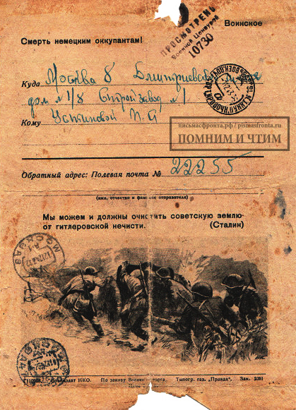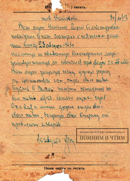 Меня зовут Мельникова Людмила Викторовна, я учитель ГБОУ Школы № 183 города Москвы. В моей семье хранится письмо с фронта о гибели первого мужа моей бабушки Устинова Георгия Александровича. Герой умер от ран, несовместимых с жизнью, в больнице г. Торопец 25 августа 1943 года.