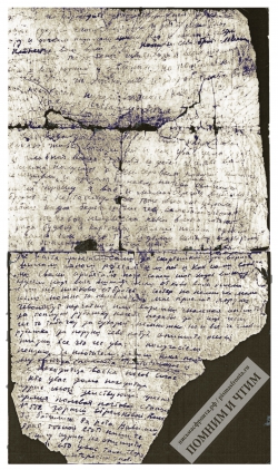 Единственное письмо папы с фронта я размножила — всем детям его раздала. Подлинник не сохранили. Я сумела прочитать. Оно было написано чернильным карандашом на обёрточной бумаге розового цвета (трудно читалось).