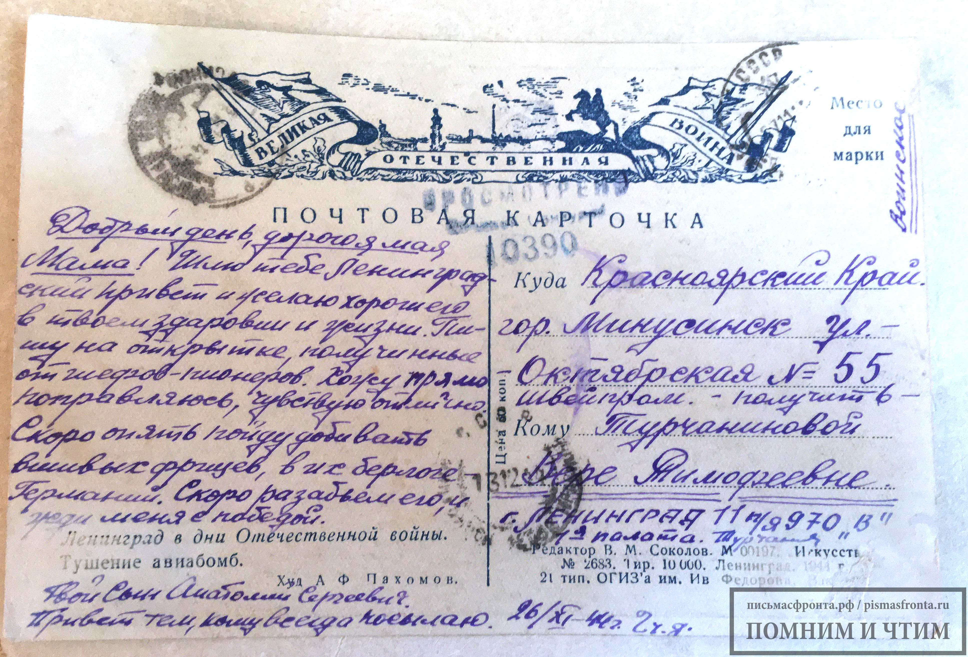 Письмо фронтовика Турчанинова к матери я получил лично от неё в 1976 или 1977 году — точнее не помню. Я тогда учился заочно в Красноярском краевом культпросветучилище (г. Минусинск) и снимал на время сессии жильё по указанному в письме адресу. Мать (указанная в адресе Вера Тимофеевна) проживала в одной из соседних квартир. Ей было тогда уже за 80 лет, и я, время от времени, помогал ей по её просьбе что-то делать по дому. Так и познакомились.
