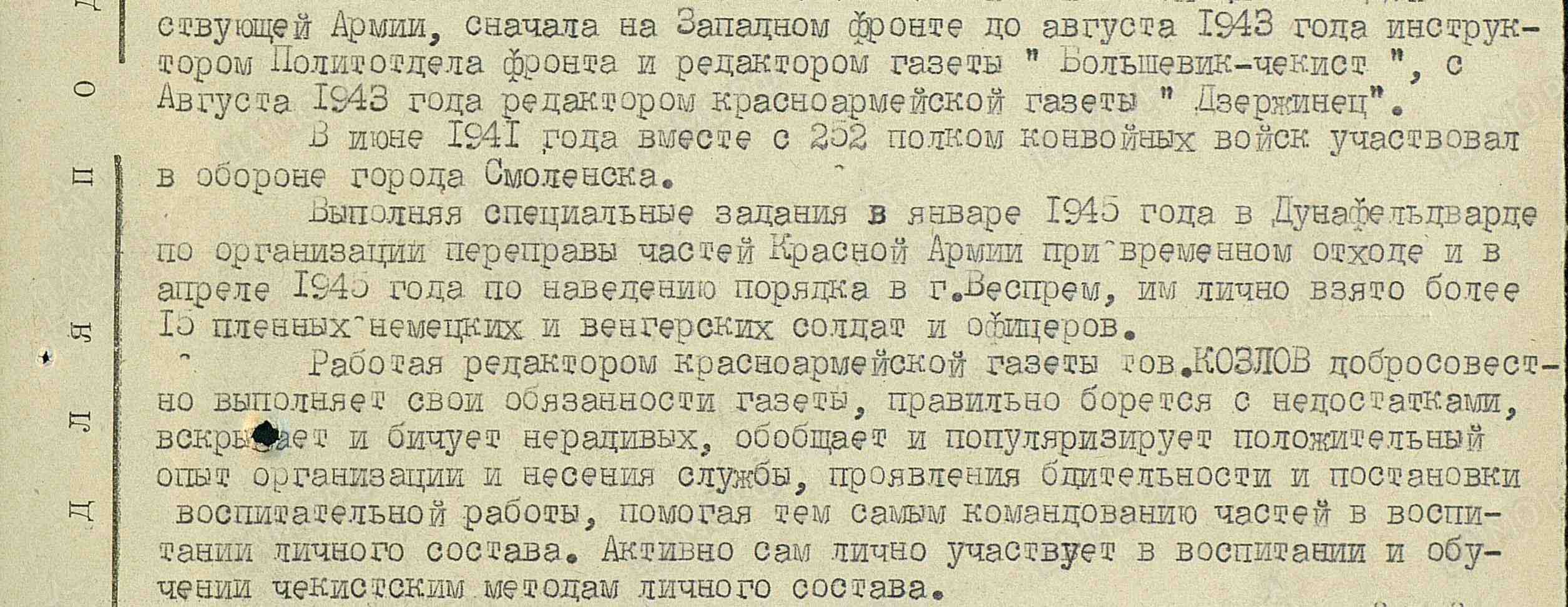 Работая редактором красноармейской газеты, тов. Козлов добросовестно выполняет свои обязанности газеты, правильно борется с недостатками, вскрывает и бичует нерадивых, обобщает и популяризует положительный опыт организации и несения службы, проявления бдительности и постановки воспитательной работы, помогая тем самым командованию частей в воспитании личного состава. Активно сам лично участвует в воспитании и обучении чекистскими методами личного состава.